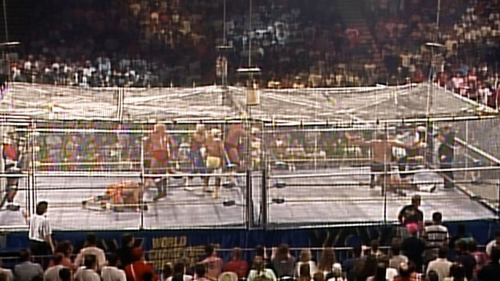 A steel structure enclosing two rings. Teams of wrestlers entering at intervals, creating suspense. It pushed the cage match concept into something theatrical and brutal.