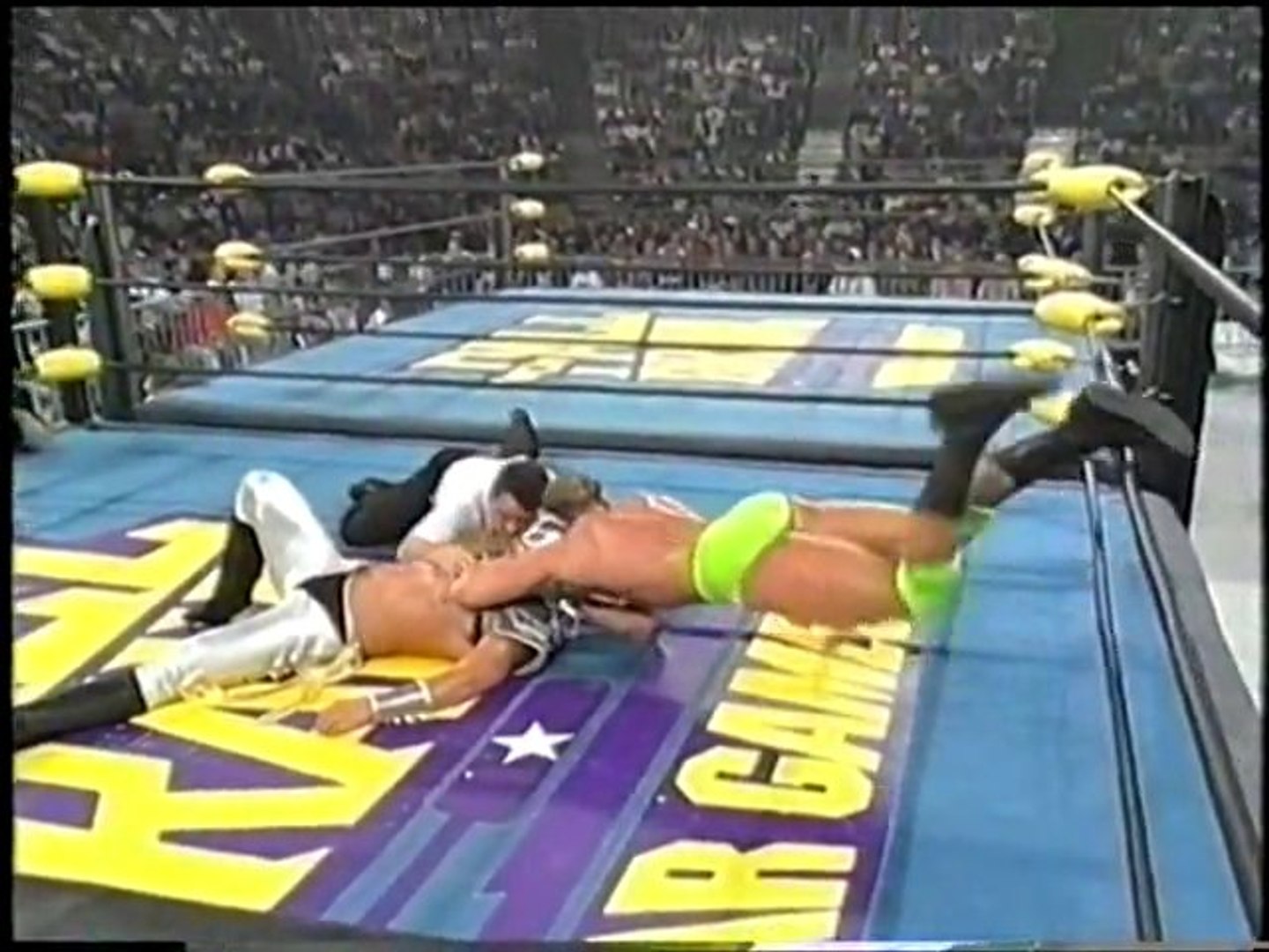Entering this match, Luger and DDP weren’t on the best of terms. Commissioner Piper removed them from the War Games match due to doubts about their cohesion. Hall and Luger begin the match, and Luger’s power shines through. Luger fires up the crowd with a pair of running forearms and a double clothesline before full body pressing Savage to the outside onto Hall. Luger tags in DDP, and it’s amazing to see how over with the crowd he is at this point. Every move he does receives a loud pop from the audience as they anxiously wait for a Diamond Cutter.